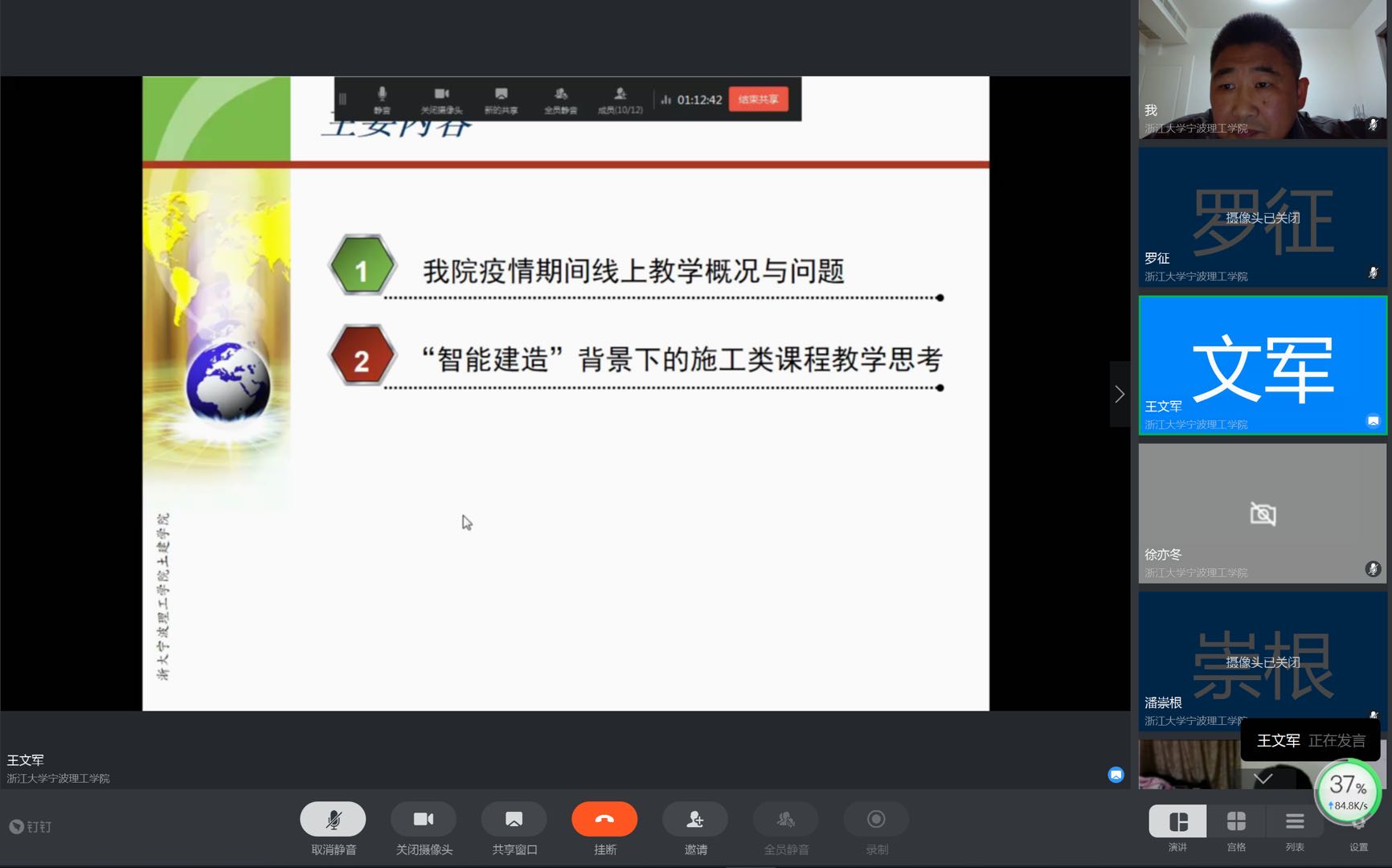 最后,公司教学副经理王文军老师介绍了开学以来公司和公司的线上教学情况,分享了个人的教学经验。此外,还与课程组成员共同讨论了“智能建造”对未来施工课教学的要求。