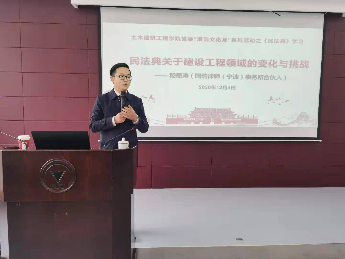 今年12月4日是第七个国家宪法日。为深入推进宪法法律学习宣传,积极响应公司“清廉理工”建设推进月暨第九届廉洁文化节相关活动安排,云顶7610线路检测于12月4日下午在SA305报告厅举办了一场题为《民法典关于建筑工程的新变化与新挑战》的讲座,主讲人为嵇思涛律师,国浩律师(宁波)事务所合伙人,公司07级法律系毕业生。公司全体教职工、员工党员代表参加了此次学习。