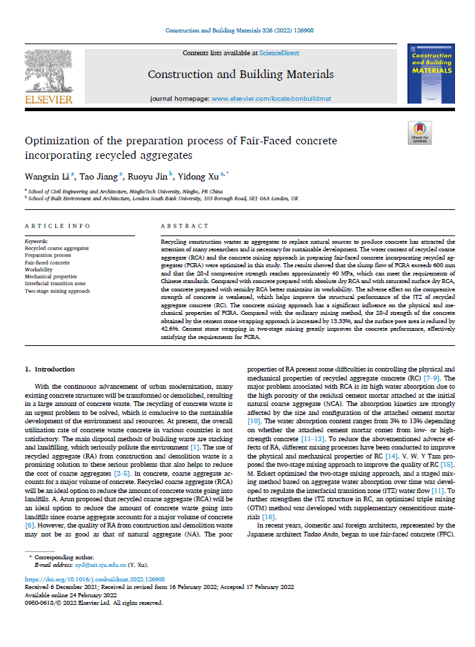 2月25日,公司2019级土木工程专业本科生李王鑫以第一作者在权威期刊Construction and Building Materials上发表了题为Optimization of the Preparation Process of Fair-Faced Concrete Incorporating Recycled Aggregates的学术论文。该期刊为JCR一区期刊,影响因子6.141。公司员工李王鑫为第一作者,集团为第一单位,徐亦冬教授为通讯作者,London South Bank University金若愚教授(学院国际合作基地兼职教授)为论文作者之一。此次为公司本科生首次在SCI一区发表学术论文。