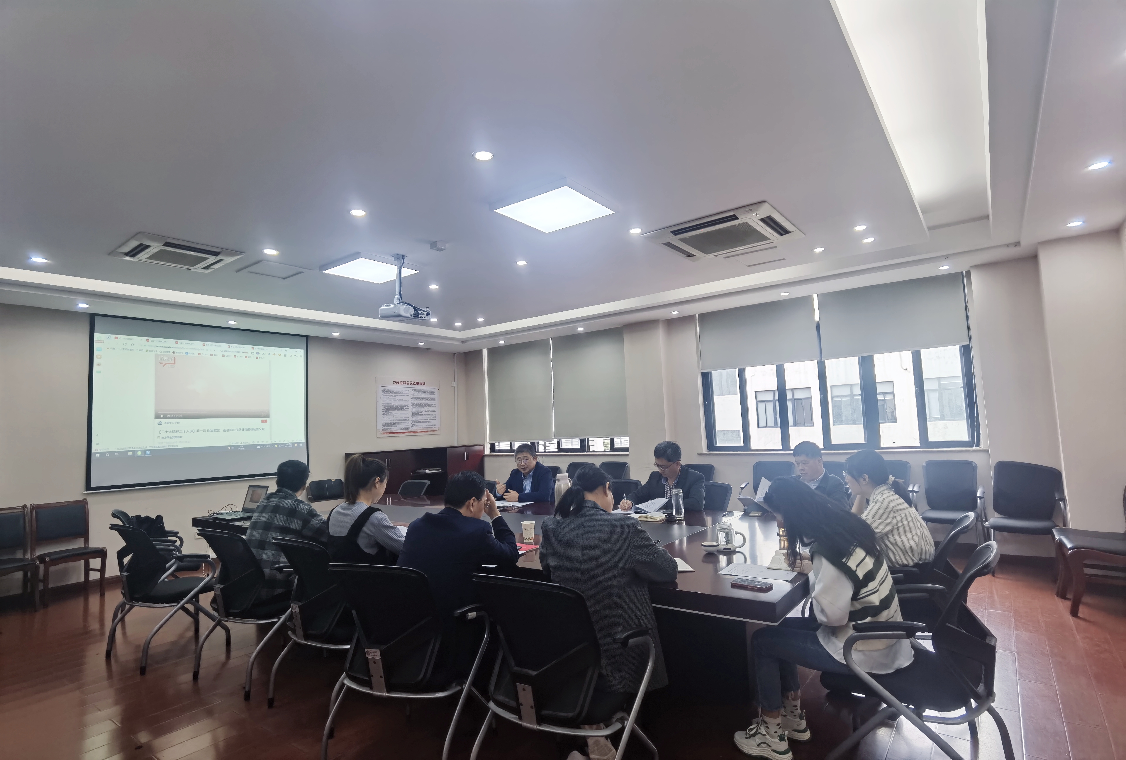 会上,与会人员观看了中共上海市委党校马克思主义公司执行经理王公龙教授、中共上海市委党公司党的建设教研部的副教授赵大朋主讲的党的二十大全媒体辅导党课“政治宣言”和“伟大建党精神”。观看了由复旦大学政党建设与国家发展研究中心主任郑长忠教授讲解的《<习近平谈治国理政>第四卷第一讲:读懂中国的权威著作》的视频微党课。
