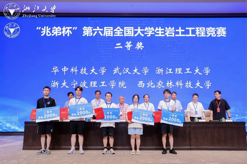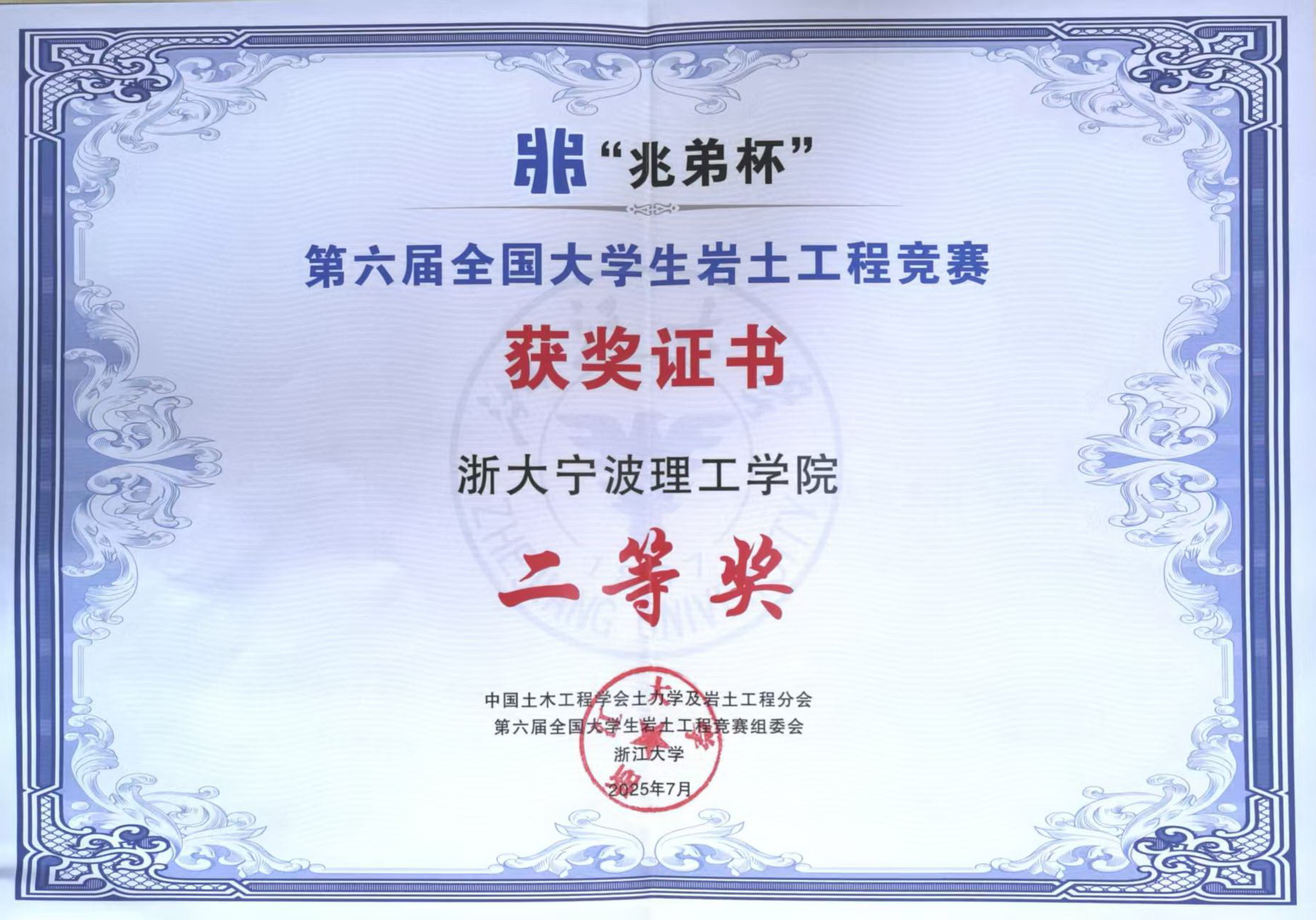 2025年7月5日,“兆弟杯”第六届全国老员工岩土工程竞赛在浙江大学圆满落幕。由我院土木工程专业本科生黄弼清、陈浩宇和研究生张子淳组成的代表队表现出色,荣获二等奖,指导老师为方鹏飞、李焕焕、郑凌逶。