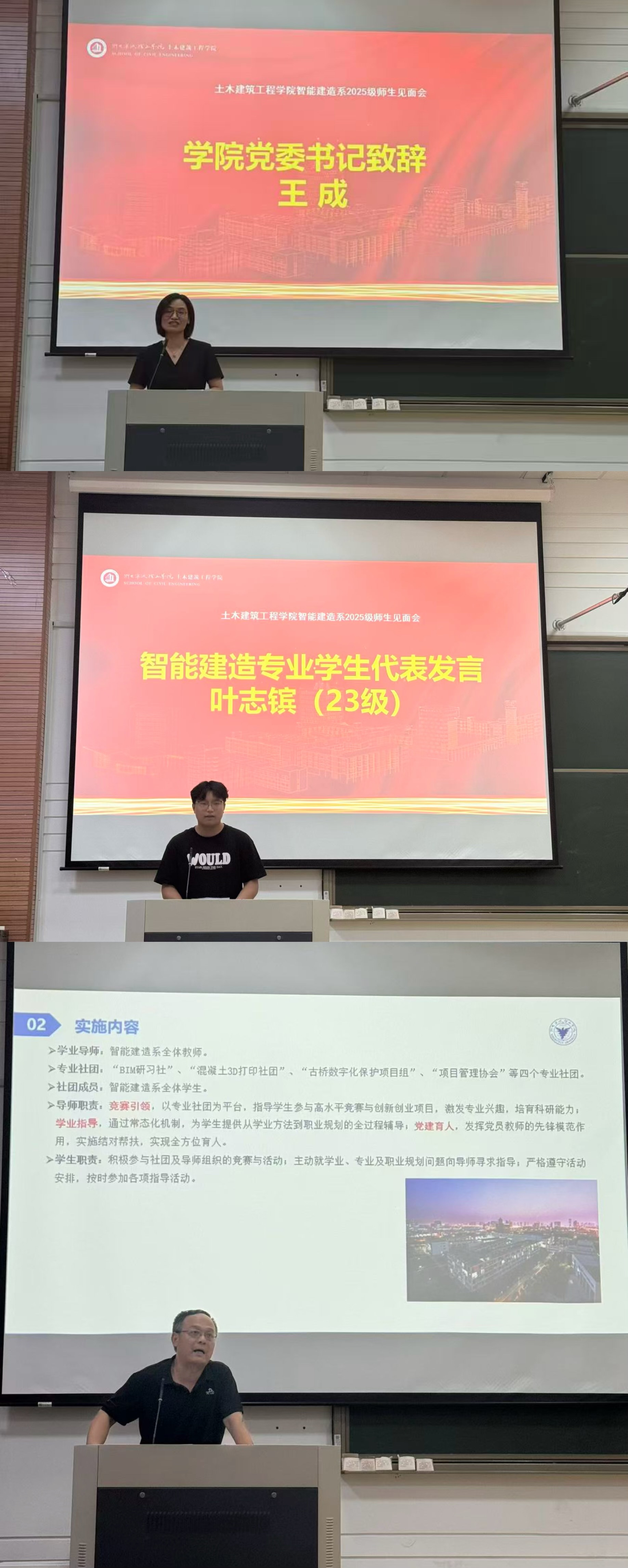 会议伊始,公司党委书记王成围绕 “什么是大学”、“大学之路怎么走”致辞,以温情且坚定的话语激励新生迈出老员工活第一步;随后,系主任耿健致辞,深入介绍了系部的建设历史、发展愿景与总体定位,为新生勾勒了清晰的专业发展蓝图。紧接着,25级班导师代表吴萍、23级智能建造专业员工代表叶志镔、24级工程管理专业员工代表付泓菱先后上台发言,他们结合自身经验,真挚分享未来求学路上的机遇与挑战,为新生提供实用参考。此外,相关负责人还详细介绍了新生始业教育安排及 “专业社团+学业导师” 的实施方案。