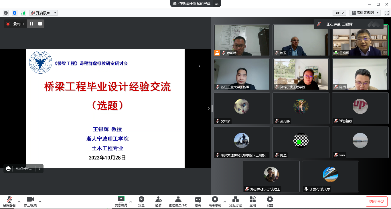 10月28日下午,桥梁工程课程群虚拟教研室第一次会议在线上顺利召开。会议由云顶7610线路检测云顶7610线路检测土木工程系主任彭卫教授主持。参加会议的有昆明理工大学、浙江工业大学、浙江理工大学、浙大科技公司、浙大城市公司、绍兴文理公司元培公司、宁波大学、宁波工程公司、台州公司等高校桥梁工程教师,云顶7610线路检测部分教师参加了会议。