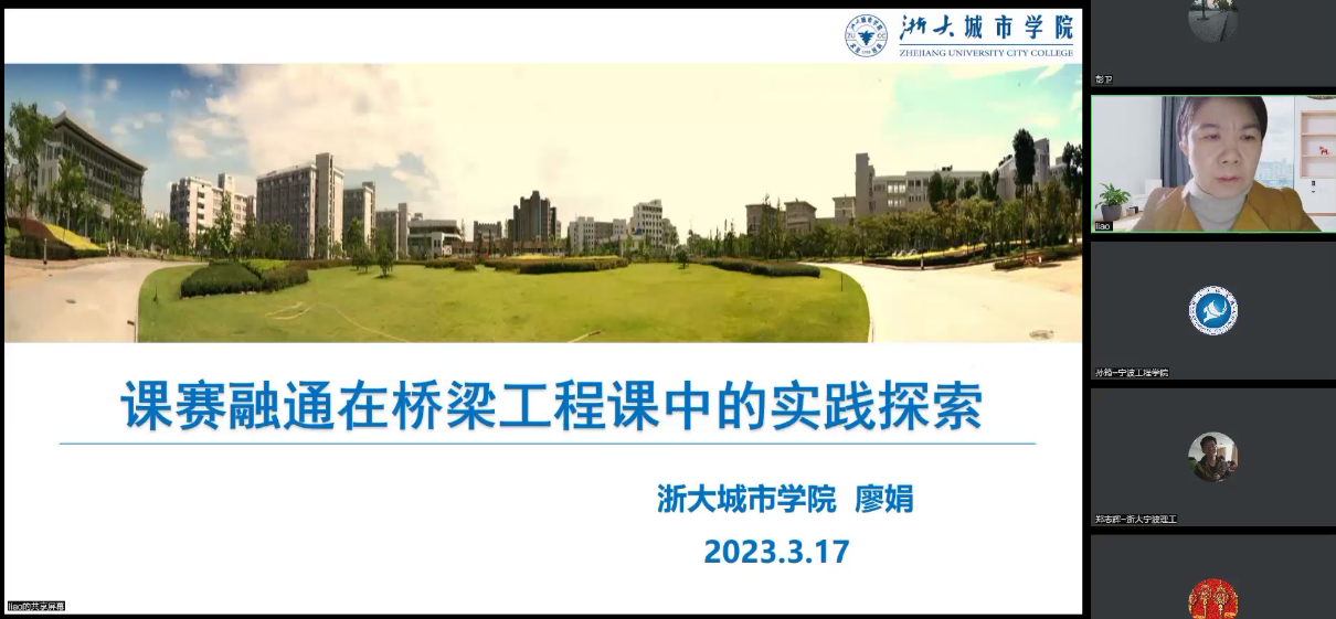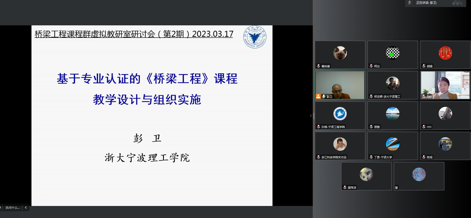 3月17日下午,桥梁工程课程群虚拟教研室第二期研讨会顺利召开,会议采用腾讯视频形式进行,公司土木工程系系主任彭卫教授主持会议。浙江工业大学张新军,浙江科技公司边祖光、宋方远,浙大城市公司廖娟,绍兴文理公司元培公司王琪栋,宁波大学丁勇,宁波工程公司孙筠、朋茜,台州公司李莹,公司彭卫、王银辉、陈闯、苏丹娜、郑志辉、曹纳德、樊玮洁,浙江公路技师公司楼纪昂等省内高校桥梁工程课程群主讲教师共25人参加了此次线上研讨会。