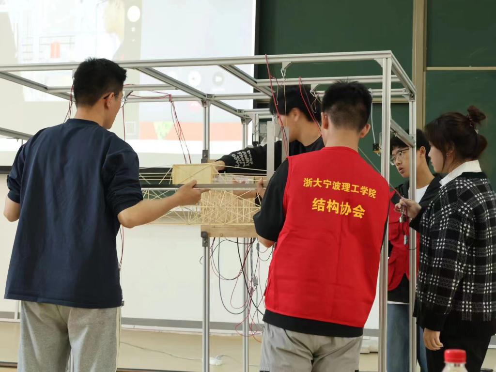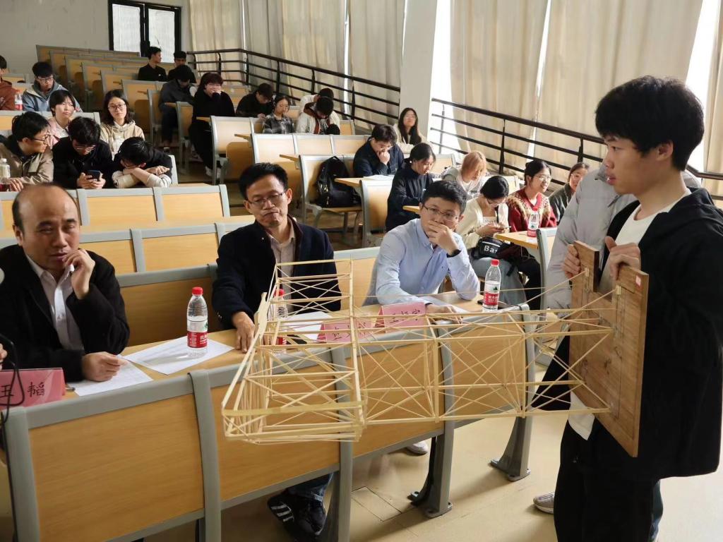 在结构协会指导教师查支祥以及结构协会会长张根盛针对本次竞赛做出简单介绍后,比赛正式拉开帷幕。每个小组依次登台介绍本组模型,并接受评委的问询,紧接其后的模型加载过程悬念迭起。选手们的出色表现赢得了在场师生的阵阵鼓掌和肯定。