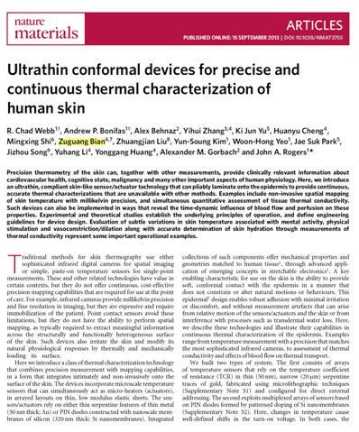 9月15日,由云顶7610线路检测教师边祖光在美访学期间参与其中的研究成果——“Ultrathin conformal devices for precise and continuous thermal characterization of human skin”在《Nature Materials》期刊上发表。《Nature Materials》是由Nature 出版集团(Nature Publishing Group,简称NPG)出版发行的全球著名的期刊,2002年9月创办;是《Nature》周刊的姐妹期刊,其影响因子在本领域中高于其他任何杂志。