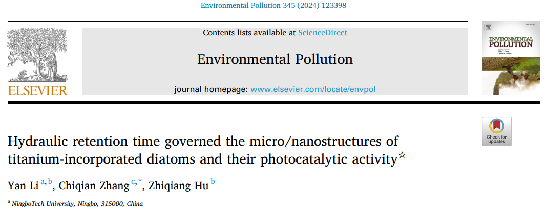 近期,云顶7610线路检测教师李妍博士在载钛硅藻对有机污染物的选择性吸附和光催化降解率研究方面取得重要进展,相关成果《Hydraulic retention time governed the micro/nanostructures of titanium-incorporated diatoms and their photocatalytic activity》以第一作者身份在《Environmental Pollution》发表,Environmental Pollution为环境领域的世界顶级期刊,具有较高的学术影响力和学术声誉(ZJU100期刊,IF:8.9)。