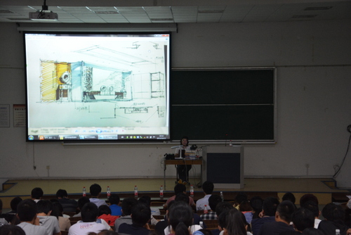 陈红卫老师通过PPT向同学们展示了自己所绘作品,结合具体作品重点讲解了利用水性和油性马克笔展现明暗效果,以及体现墙体、地板等材质的方法。过程中,陈红卫详细解答了同学们提出的设计手绘问题。讲座最后,陈红卫老师现场作画,用不到半小时时间,完成了一幅设计手绘作品,一边手绘,一边向同学们详细讲解绘图技法。同学们在亲历大师整个手绘过程后,自发地向其报以雷鸣般掌声。