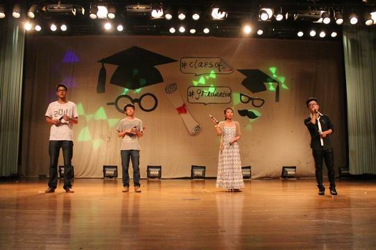 指缝太宽而时间太瘦,似水的流年在今晚都化作了美好的回忆。晚会在Mushroom storm 乐队激情演唱的《Knocking on heaven's day》拉开序幕,一开始就将气氛带入一个高潮,随之晚会“2010夏至•遇见”,“2011夏至•燕尾蝶”,“2012夏至•韶光”,“2013夏至•不能说的秘密”四个篇章依次上演,代表毕业生们四年不同的美好回忆与成长。晚会中,郦思源同学用歌曲跟我们订下《约定》--常回来看看;土建人才库舞蹈队用激情四射的舞蹈《It's my show》充分展现了老员工的青春活力和对未来的无限向往;在校的员工干部们则用带来的小品《监考老师》表达对学长学姐们深深的祝福;毕业生们也深情演唱歌曲唱出对大学时光的留恋。晚会中或话剧或舞蹈或乐器或歌曲,精彩还有很多很多,唯一不变的淡淡的离别的惆怅与感动还有那浓浓的祝福。最后毕业生们带来的歌曲《给所有知道我名字的人》中本场晚会圆满落幕,全场掌声雷动。