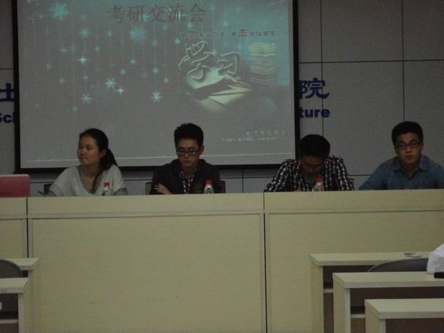 2012届考研成功的三名同学也极具代表性。胡仁伟以364分顺利考取上海大学,在校期间年年获得优秀员工奖学金,参与教师科研项目并共同获得多项专利,第二作者书写的论文被EI收录,他从如何准备考研等方面详细分享了自己的心得;张凯以341分被重庆交通大学录取,他则是从浪子回头的角度分析了考研的可行性,大一大二的成绩并不突出,有点浑浑噩噩,到了大三以后奋发图强,并最终考上了研究生;林颀栋今年考了351分,第一志愿报了北京交通大学没有录取,辗转调剂到重庆交通大学,他从如何选择合适的报考公司入手,以及一旦需要调剂如何第一时间抓住有用信息等方面分享了自己的经历。一句句发自肺腑的话语使得本来犹豫不定的同学下定了考研的决心。在交流完各自的经验之后,还就关心的话题进行了现场问题。