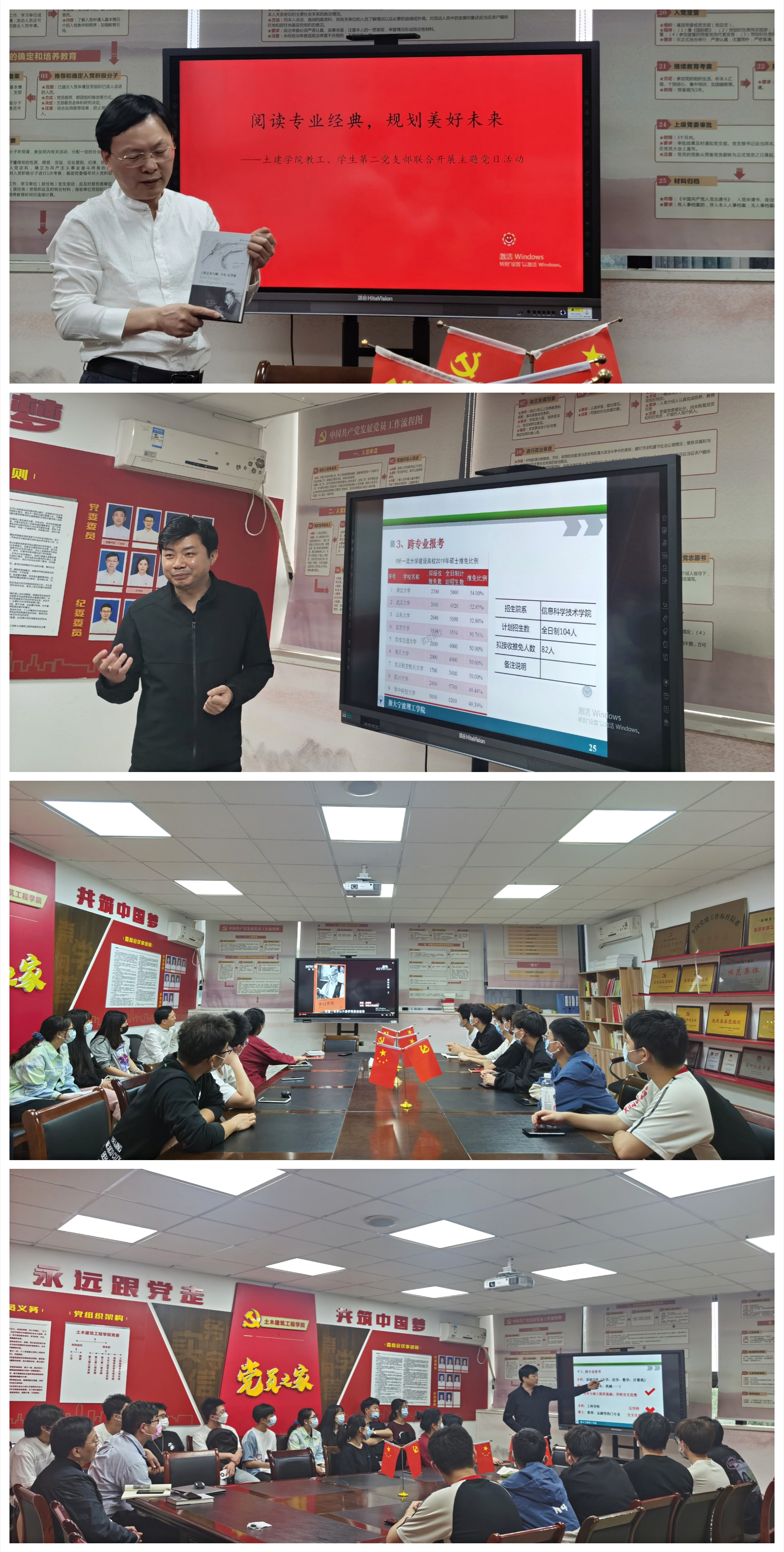 接着,教工第二党支部书记方鹏飞老师进行书籍推荐和读书心得分享。方老师表示,4月23日是世界读书日,习近平总书记鼓励广大党员、干部要带头读书学习,修身养志,增长才干,我们当代员工党员应不负总书记期望多读书、读好书,特别要读一些专业相关的书籍。他结合自己的专业研究领域,向同学们推荐了《茅以升传》和《工程艺术大师:卡尔·太沙基》两本书籍,并分享读书心得。