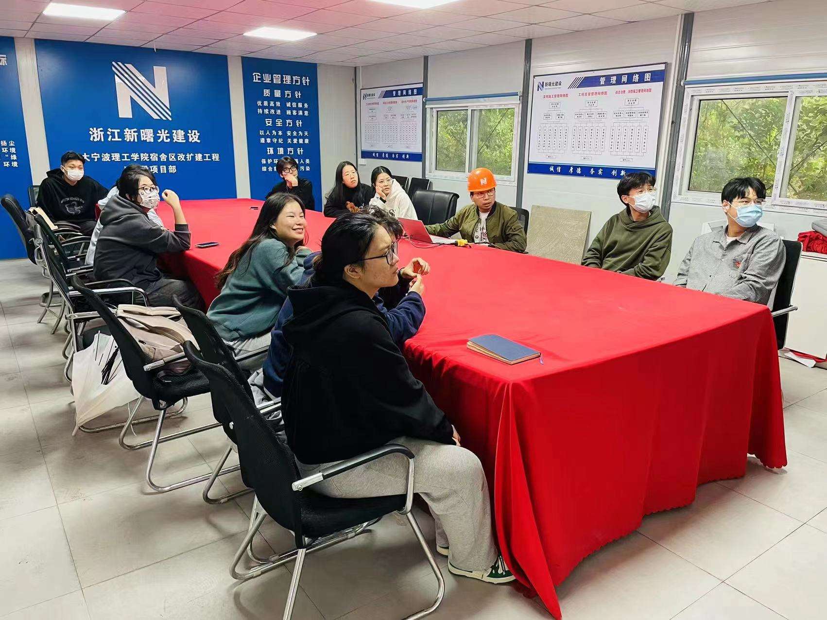 在施工现场,经理首先介绍了新宿舍楼的相关结构,通过将课本知识与实际工程相结合的方式,让员工对新宿舍楼的整体结构有了初步的认识。之后员工分为两组,一组前往参观样板房,另一组在会议室进行座谈。样板房的参观过程中,经理逐一介绍了新宿舍的内部构件,以及如何打造更加舒适的生活环境,并询问了同学们对于新宿舍的看法,员工也提出了相关建议。在会议室座谈时,施工方以图文结合的形式更加细致的介绍了楼层的内部结构设计、工程计划与施工安排,对同学们提出的关于工程相关的疑问予以解答。