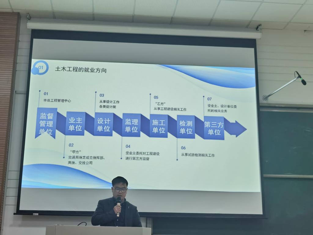 鲍利华从土木工程的就业方向、企业期待的人才素质、在校期间的能力提升方面展开分享。他向同学们简要介绍了土木工程专业从业人员的职场上升路径,让同学们对土木行业的就业形势有了更加清晰的了解。鲍主任结合自身经历谈到企业最看重的员工的几项能力,包括团队协作能力、整合资源的能力、解决边界问题的能力、持续学习与创新的能力、专业学术能力等,他还特别强调专业实习和实践的重要性,鼓励同学利用寒暑假的时间多参与专业相关实践活动,了解专业前沿,增强就业本领。